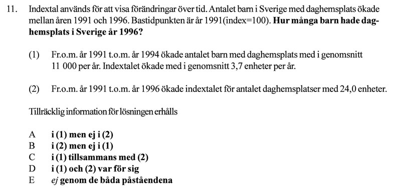 Hej, jag skulle behöva hjälp med att förstå hur man löser denna uppgift. Det verkar vara mycket information i uppgiften som man behöver sortera på för att kunna komma fram till svaret. Vi vet utifrån påstående 1 att mellan år 1991 och 1994 så hade antalet barn med daghemsplats ökat i genomsnitt med 11'000 per år. Men jag är inte med på kopplingen mellan indextalet, och antalet barn i Sverige med daghemsplats. Hur vet man om P(1) är tillräcklig för att lösa uppgiften? På samma sätt med P(2)?