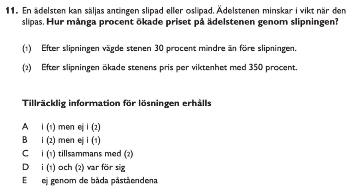 En ädelsten kan säljas antingen slipad eller oslipad. När ädelstenen slipas minskar den i vikt. Vi ska räkna ut hur mycket priset på ädelstenen ökar genom slipningen, i procent.