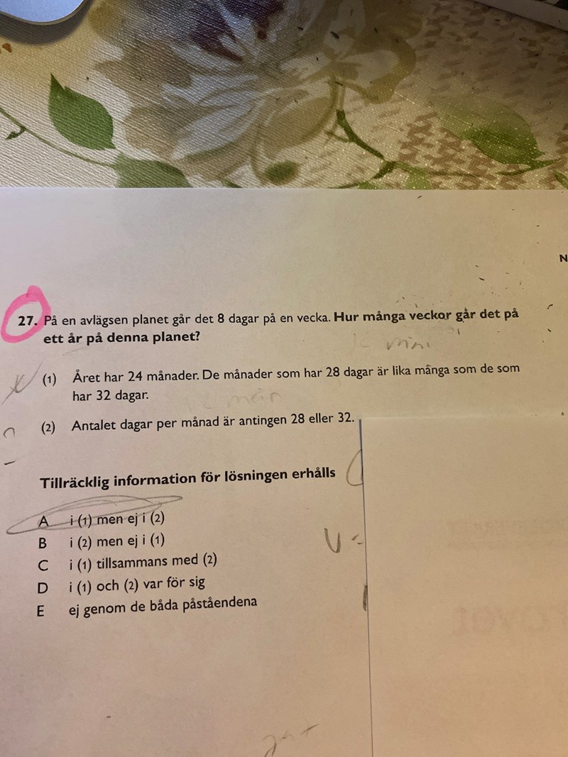 Jag tänkte att man fick all information man behövde i A, jag tänkte 12 mån har 28 dagar och 12 mån har 32 dagar och därför är det totalt 336 dagar på året och sedan tar jag reda på antalet veckor genom att ta 336/8= 99 v. Enligt facit är svaret C.