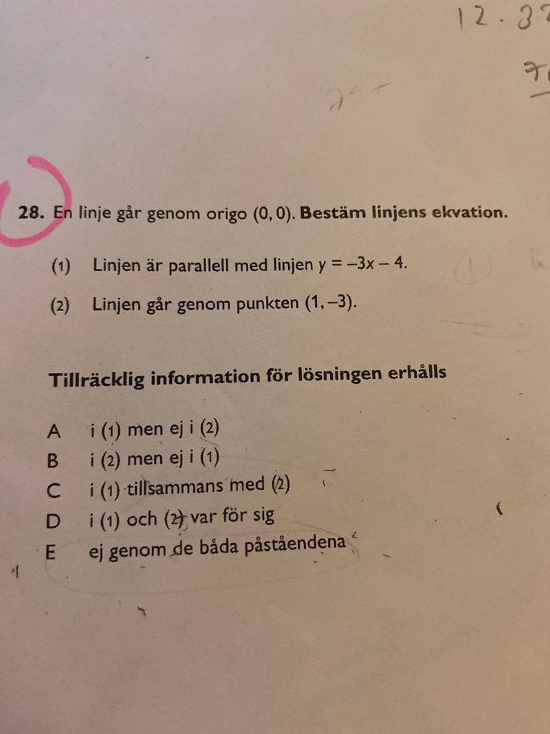 Varför är svaret D i denna uppgiften? Jag kan inte riktigt förstå hur man ska beräkna linjens ekvation med hjälp av de olika informationerna var för sig… (1) ger oss k=-3 och sen vet vi enligt grundinformationen att linjen går genom origo vilket betyder att linjens ekvation saknar m-värde?? Och därför är svaret y=-3x ??
