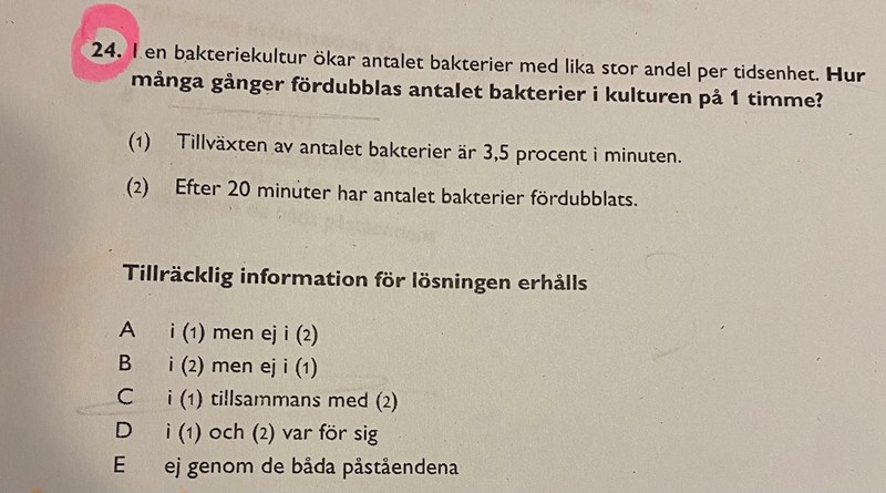 Av någon konstig anledning började jag tänka på exponentialfunktioner när jag såg denna uppgift men jag kanske bara krånglar till det mer än nödvändigt. Känner mig väldigt vilsen… Jag undrar också varför uppgiften inte kan lösas enbart med informationen i (1)?