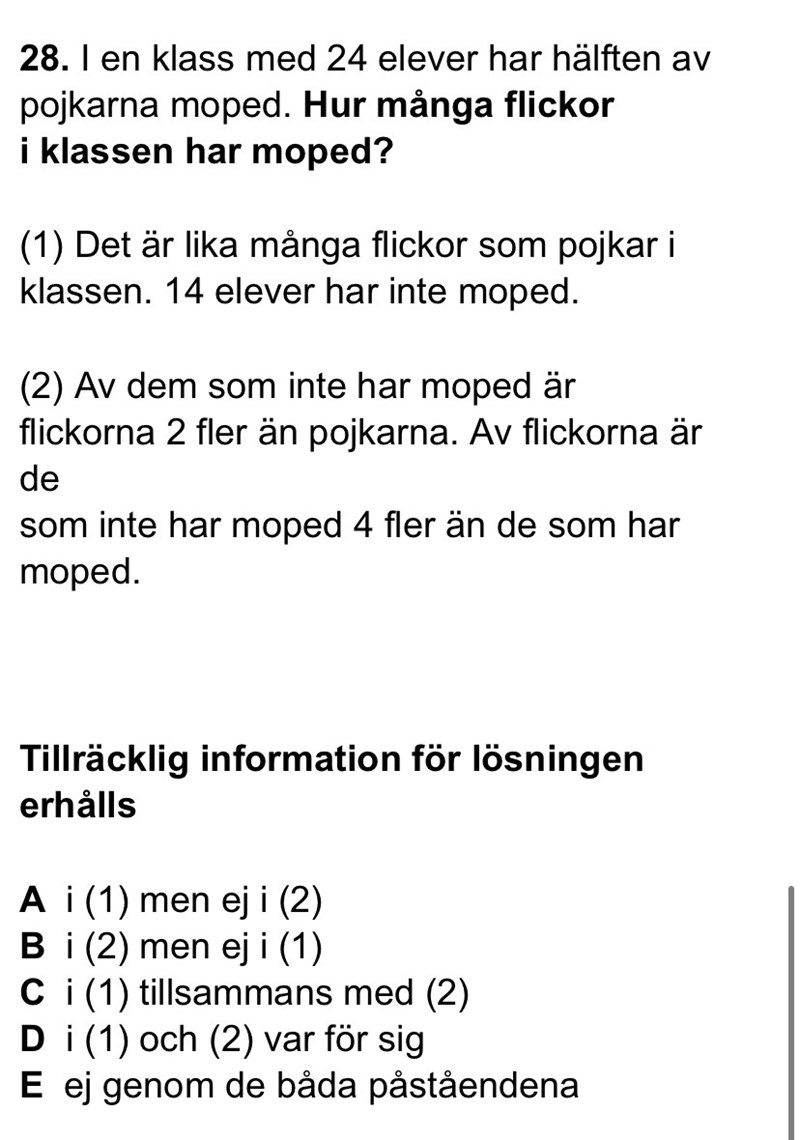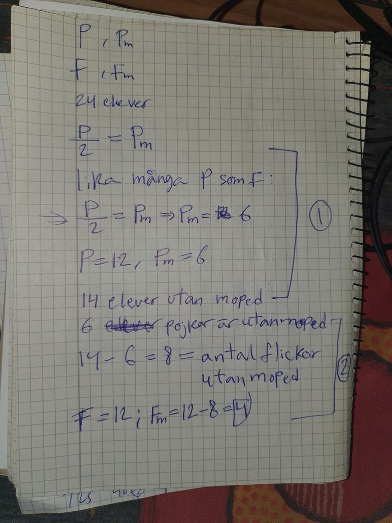 I (1) får du reda på att det finns lika många pojkar som flickor. 12 av varje samt att hälften av pojkarna har moped. Alltså har pojkarna 6 mopeder. Eftersom det finns 14 elever som inte har moped finns det alltså 24-14=10 mopeder. Alltså har tjejerna 10-6=4 mopeder.