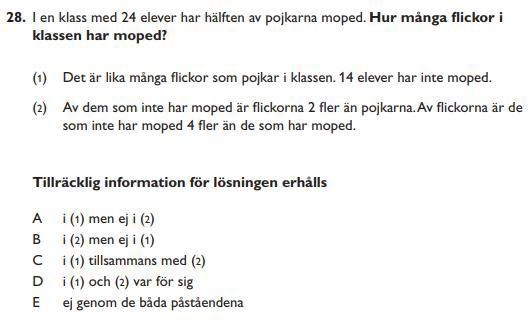 (1) Det är lika många flickor som pojkar i klassen, alltså 12 vardera. Hälften av pojkarna har moped, alltså 6. 14 har inte moped, därmed har 10 moped, varav bara 6 är pojkar. Alltså har 4 flickor moped. Inga konstigheter.