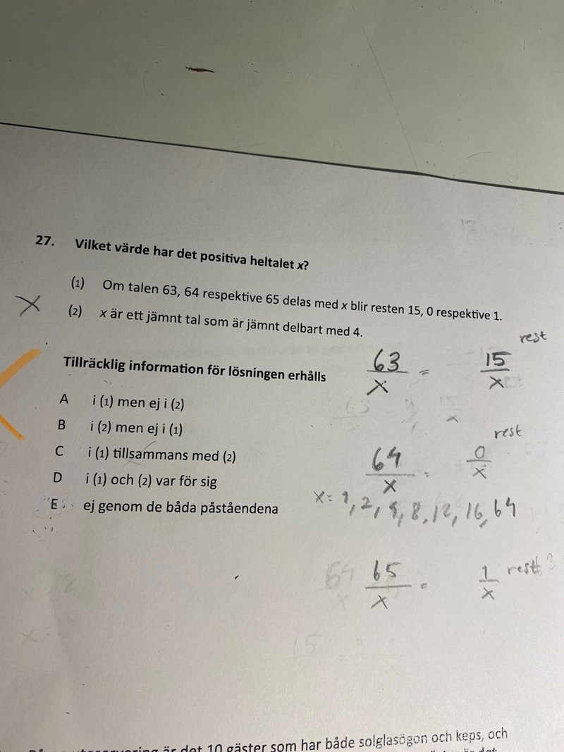 När man delar 64 med x går det jämnt upp. Det betyder att x = 32 eller 16 (8, 4 och 2 är ju mindre än 16).