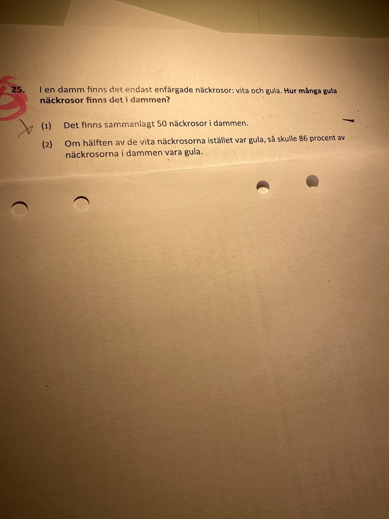 Tack! Men förstår då inte varför de säger i ”istället skulle vara gula” i (2) ? Då blir jag osäker när jag beräkna antalet gula, och får svaret 43, att det inte är det slutgiltiga svaret utan att det bara gäller om hälften av de vita näckrosorna också skulle vara gula… om du förstår vad jag menar:/ Blir förvirrad varför de skriver så