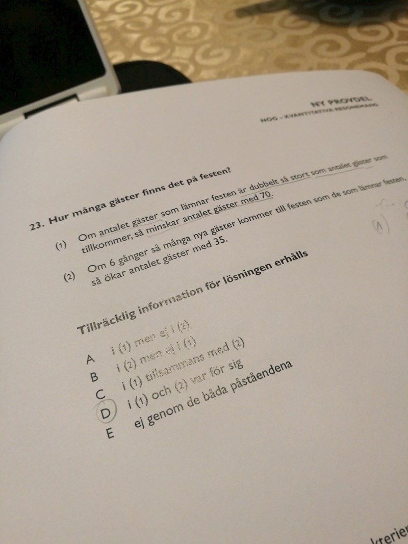 Nej, jag tänkte fel. Få se: a-2x+x = a-70 respektive a+6x-x = a+35 där a är antalet gäster på festen och x de som tillkommer/lämnar. Den första ekvationen ger att x = 70. Den andra ger att x = 5. Vi har ingen aning om hur många gäster det var på festen. Alltså E.