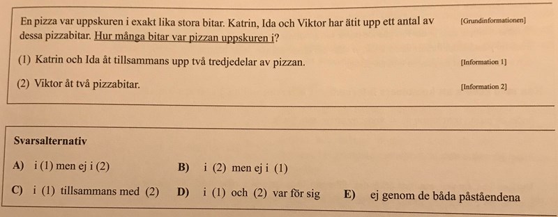Okej, då förstår jag bättre. Det rätta svarsalternativet är nämligen "E) ej genom de båda påståendena", vilket med största sannolikget grundar sig i att vi inte vet om de ätit upp hela pizzan eller inte.