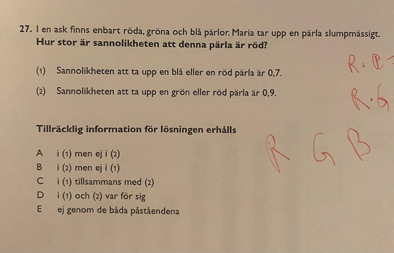 Jag har problem med följande fråga. Rätt svar ska vara C, men jag förstår verkligen inte hur man kan använda den informationen för att komma fram till svaret. Jag förstår att jag inte behöver räkna ut svaret då det är en NOG fråga, men vilken information är det som låter mig ta reda på sannolikheten för endast en röd kula? Så som jag tänker behöver jag ju sätta upp en ekvation och då behöver jag ju två samband för två variabler, men nu är det ju två samband för tre variabler. (ignorera mina anteckningar på sidan)
