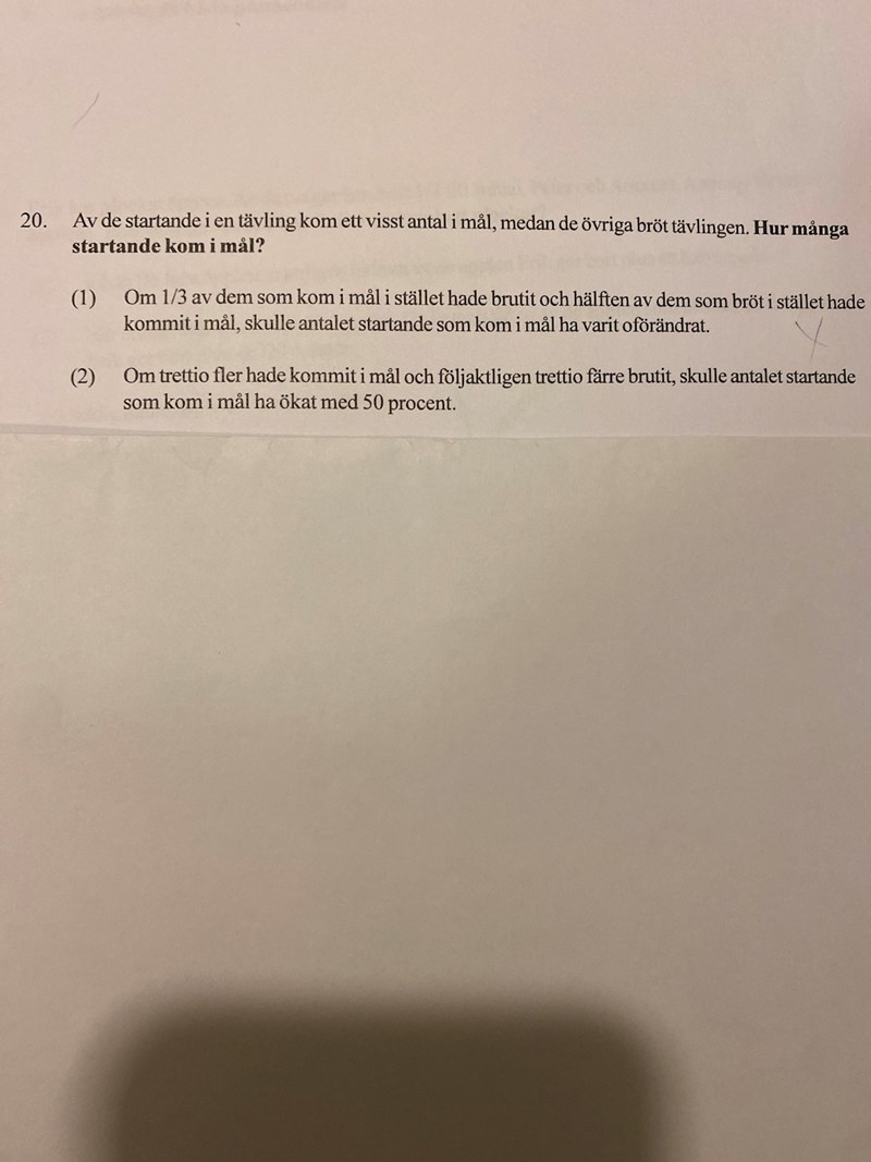 Hej! Undrar om jag tänkt rätt i denna uppgiften, får antalet tävlande som kom i mål till 60 st.