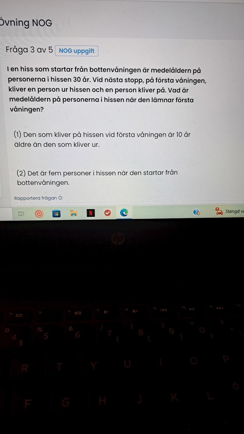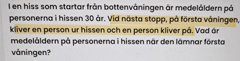 1) hur vet du att totalåldern minskar med 30 år bara för att en person kliver ut hissen? Den matematiken hänger jag ej med på. Vidare säger du att antal personer sjunker från 5 till 4. Den biten är jag med.