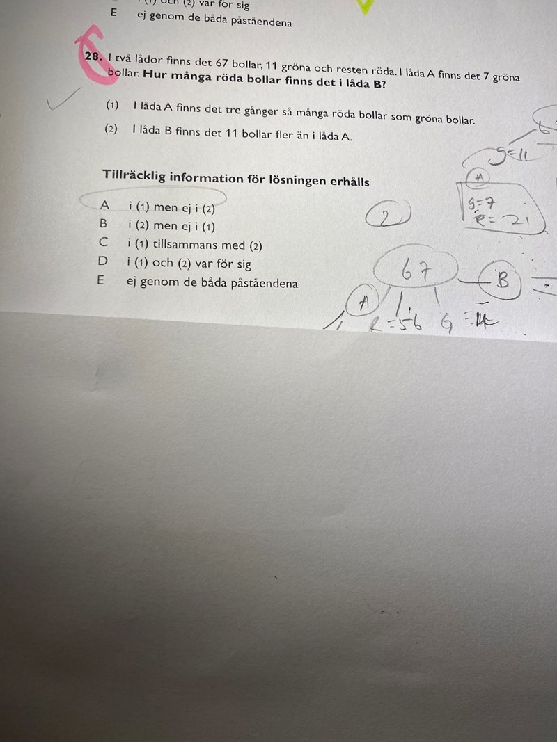 I låda B finns det elva fler bollar än i låda A. Eftersom det finns 67 bollar totalt innebär detta att det finns 28 bollar i låda A, och 39 bollar i låda B. Hur många gröna bollar finns i A? Hur många av bollarna i A är då röda? :)