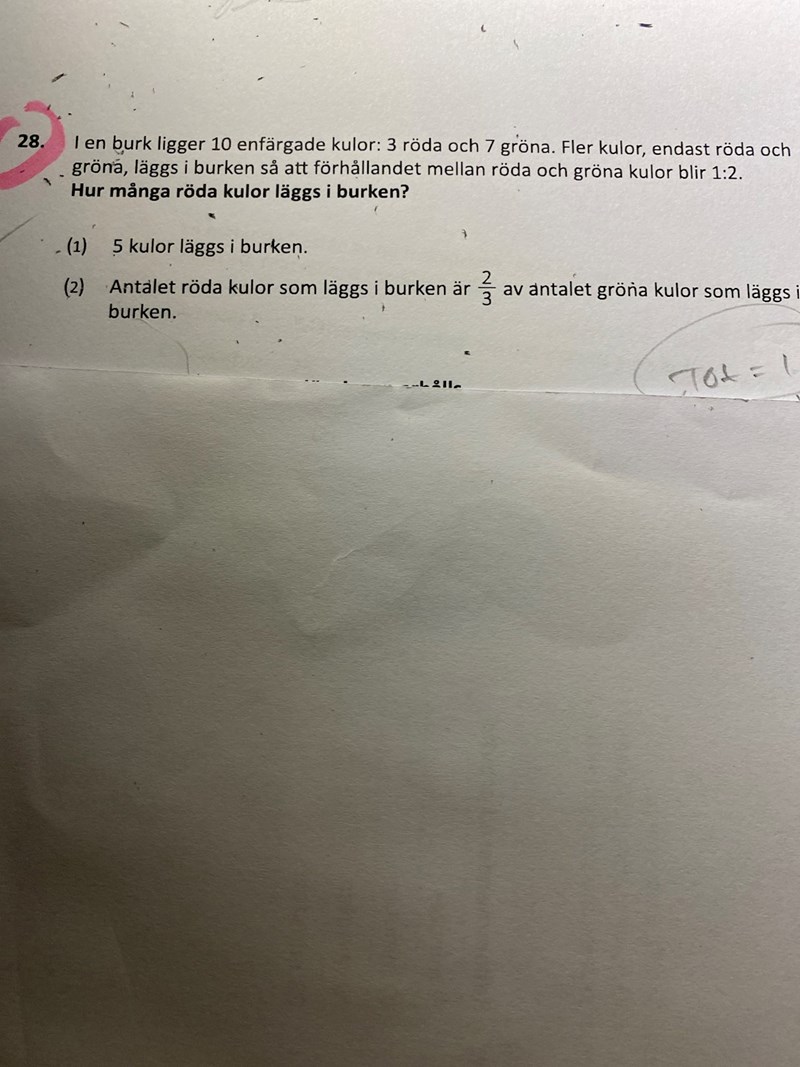 För G står väl inte för alla gröna kulor det är väl G+7 det borde stå istället ? G står ju bara för det nya antalet gröna kulor och i grundinformationen var det väl fråga om det nya förhållandet mellan ALLA gröna kulor (dvs både de nya och de gamla, G+7?) och alla röda kulor?