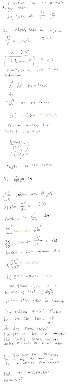 jag behöver främst förstå hur man kan tolka dV/dx, volym per x? Förstår inte hur vissa derivator ska tolkas och det gör det svårt för mig. När man ska lösa en uppgift som denna, hur bör man då gå till väga?
