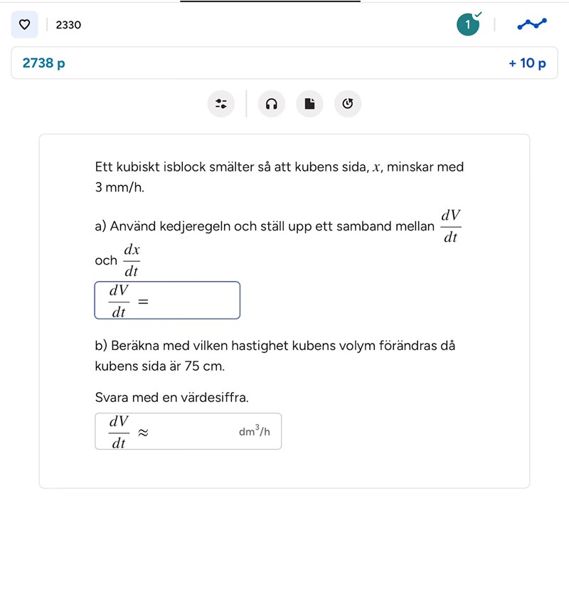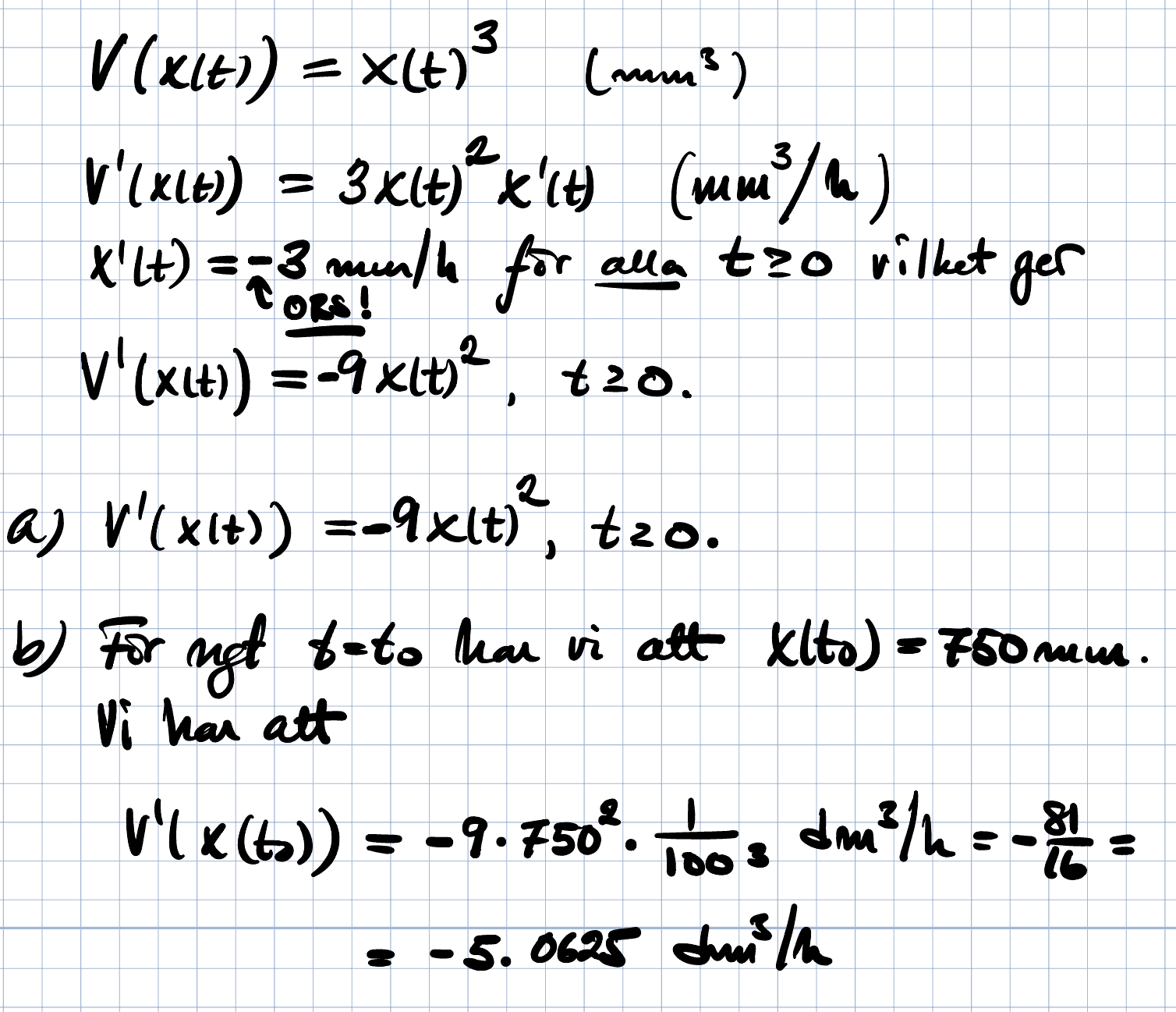 Jag betonar det som faktiskt var svaret på din fråga: ska tolkas som volymens förändringshastighet, alltså hur snabbt den förändras, med avseende på hur sidan förändras.