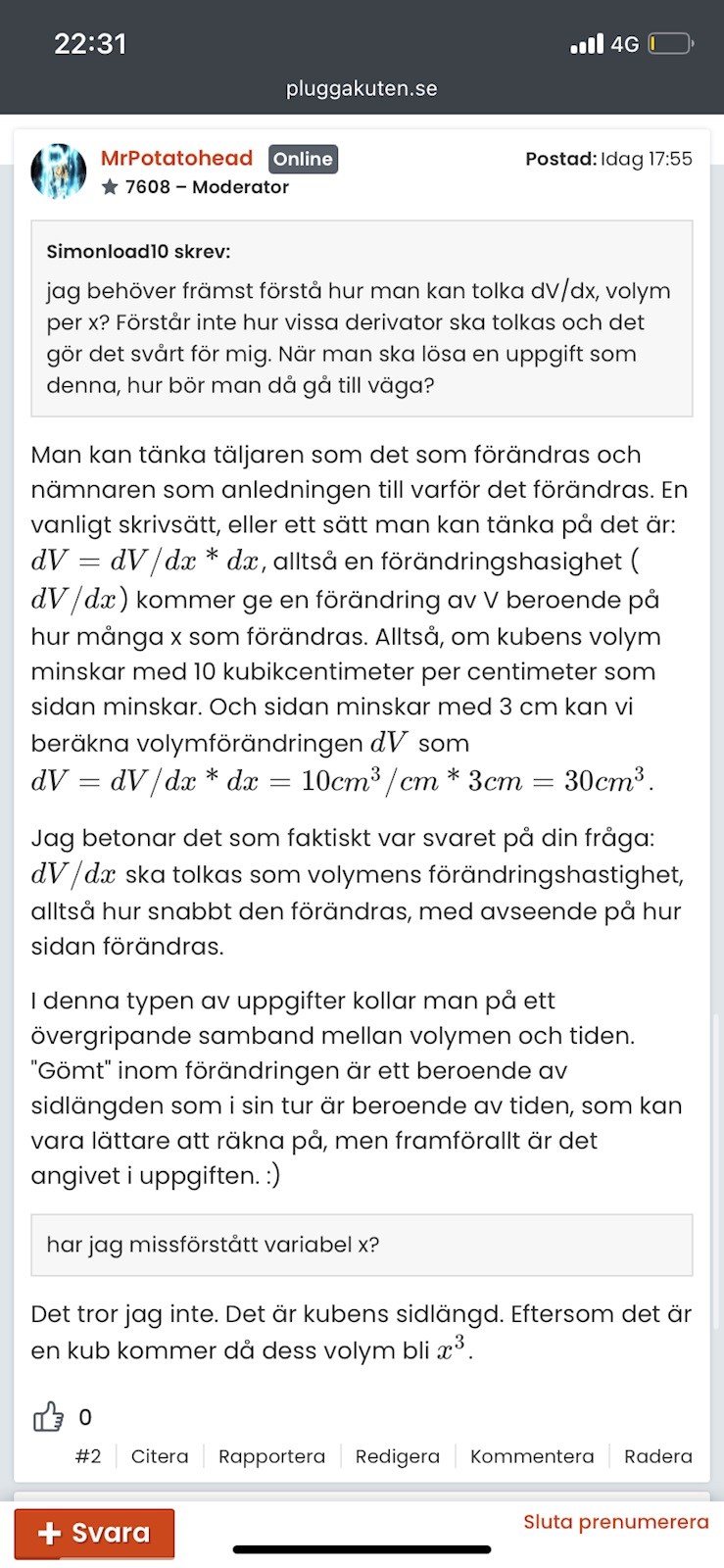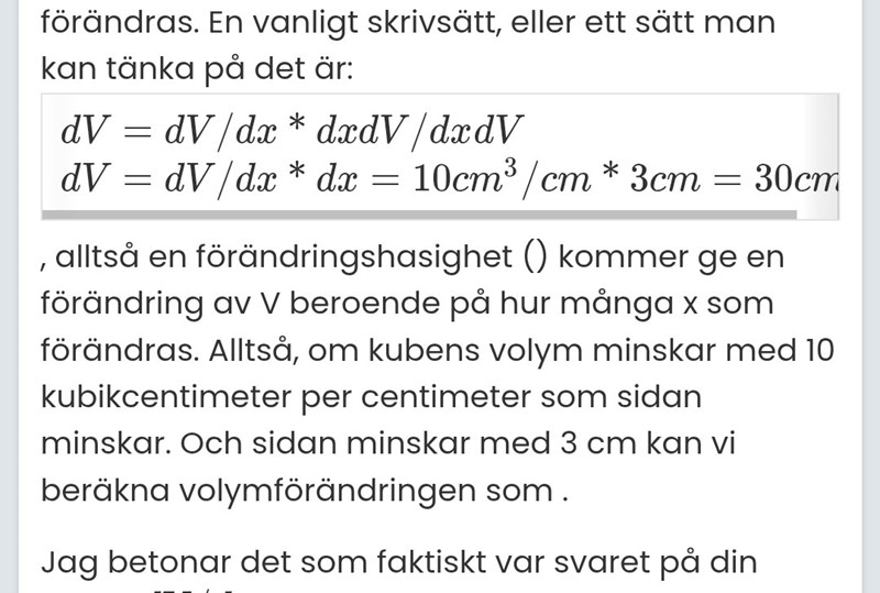 Simonload10 skrev:jag behöver främst förstå hur man kan tolka dV/dx, volym per x? Förstår inte hur vissa derivator ska tolkas och det gör det svårt för mig. När man ska lösa en uppgift som denna, hur bör man då gå till väga?