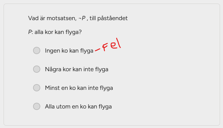 Om jag har '10 kor som jag vet kan flyga'. Sen tänker vi den exakta motsatsen till detta. Jag ponerar så logiskt jag kan utan matte magi...
