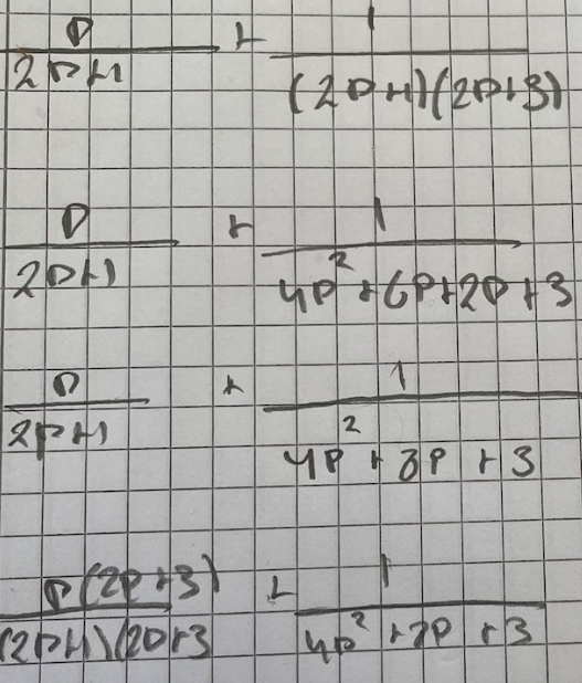 Hela denna del är onödig, jag borde bara ha behållt VL med nämnaren (2p +1)(2p+3) istället för att förlänga, multiplicera, för att sedan slutligen bryta ut igen. Är det liksom lite av en oskriven regel att man vid bevisföring inte ska utföra multiplikationen vid förlängningar och/eller när man tillämpar kvadreringsregeln eller konjugatregeln? Får man bättre överblick då på något sätt?