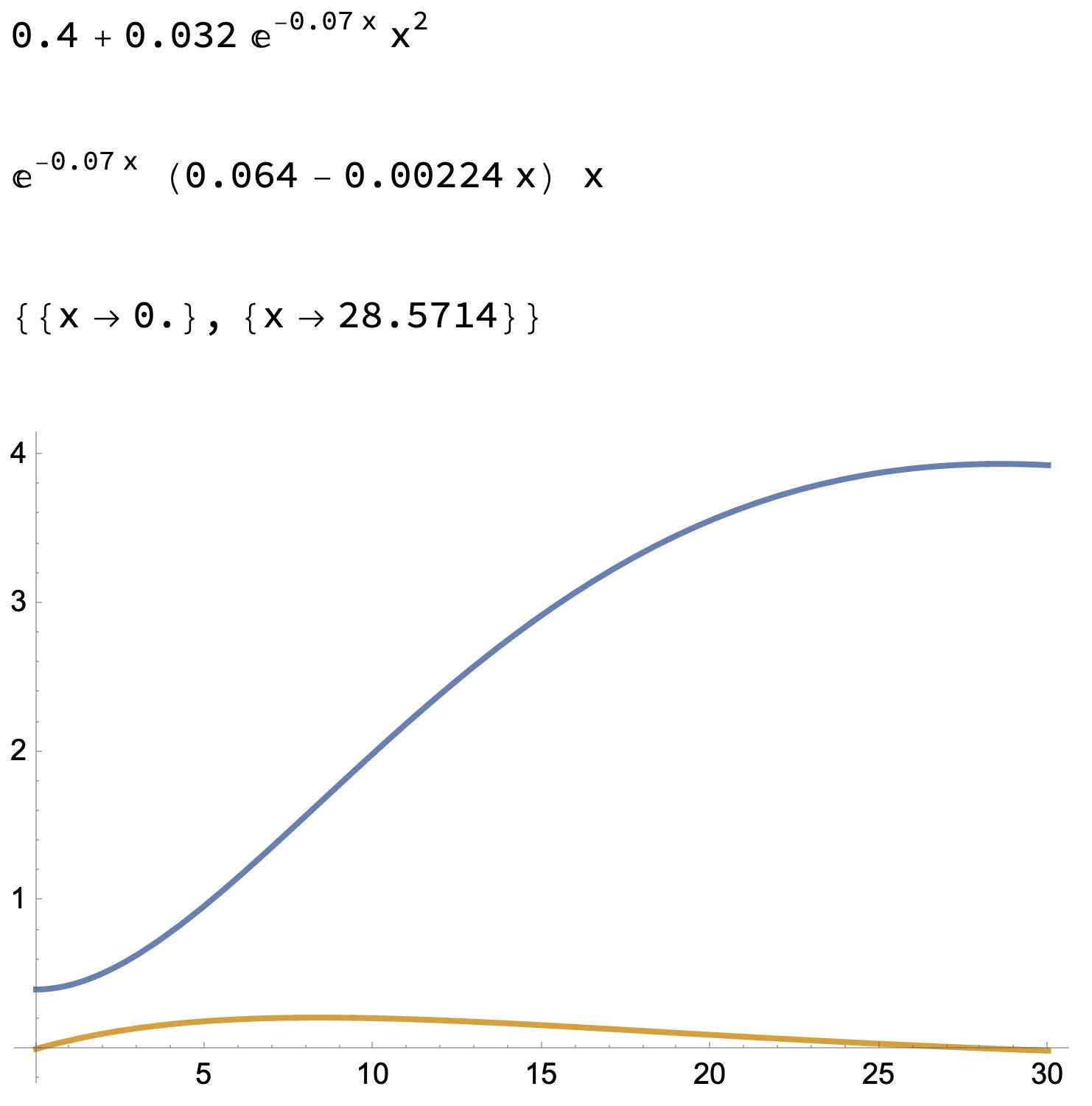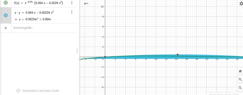 Kan det ha att göra med att du ritar ..... 0.0024 (fel), men räknar på 0.00224 (rätt). Geogebra kommer att anv. f(x) för att beräkna nollställen etc.