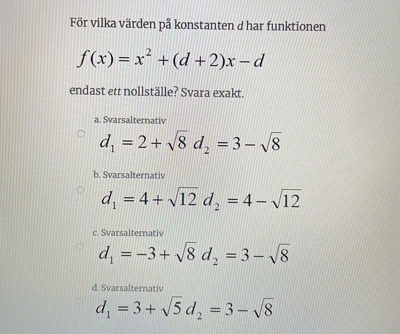 Har testat alla alternativ, varje en av de har två nollställen. Kan det va sant 😩