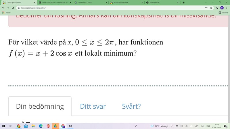 Du har mycket riktigt fått de 2 x-värderna där derivatan=0 inom intervallet. Dock måste du studera för vilket av dessa 2 värden som det är just en minpunkt. Båda/ingen/en? Gör det via t.ex. en teckentabell så borde det klarna.