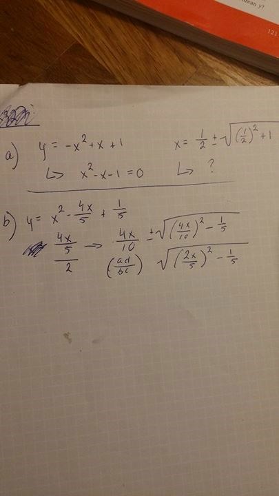 b) Du har glömt att tänka bort x:et. I PQ räknas endast koefficienter. Du får därför 25±(45)2-15.