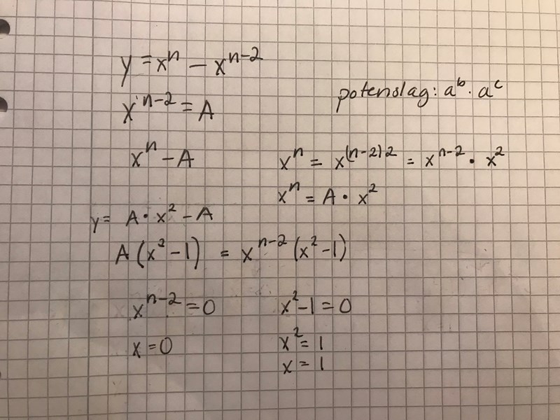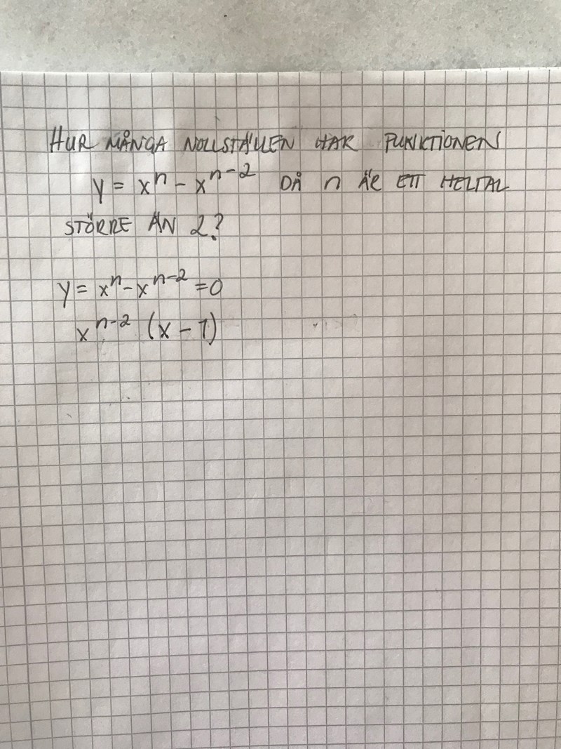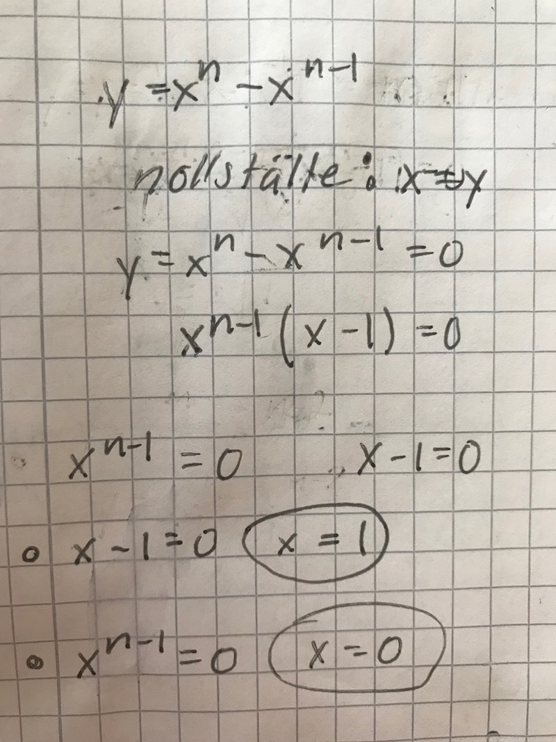kommer in eftersom hela funktionen är . skrivs om med omskrivningen, och sedan kvarstår . Totalt får vi . Sedan kan du lösa för nollställen som du gjort i förra uppgiften.