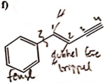 f) 1-fenyl-trans-but-1-en-3-yn (ej metylgrupper vid kol 1 och 2)