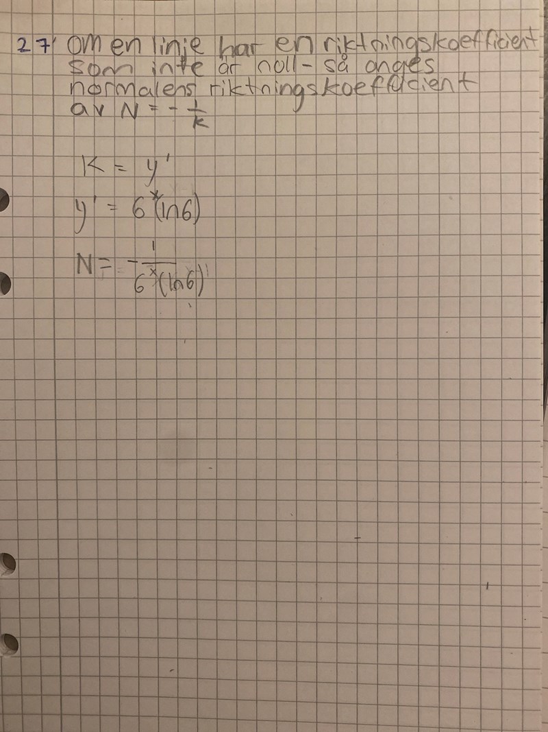 Efrersom normalens ekvation kan skrivas y=knx+my=k_nx+m så får vi att y=-1ln(6)x+my=-\frac{1}{\ln(6)}x+m