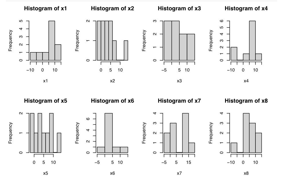 Det är utfallet av dina 8 stickprov ur samma normalfördelning. I t.ex. x1 tycks ett(1) av värdena hamnat mellan -10 och -5, ett(1) av värdena mellan -5 och 0, ett(1) av värdena mellan 0 och 5, fem(5) av värdena mellan 5 och 10 samt två(2) av värdena mellan 10 och 15. Att den sedan inte råkar bilda en fin Gauss-kurva beror på att det är så få värden att de råkat fördela sig på ett sätt att det är mer värden i övre halvan av fördelningen, men om du skulle begära att få ut säg 1000 stickprov skulle det antagligen likna en Gauss-kurva mer.