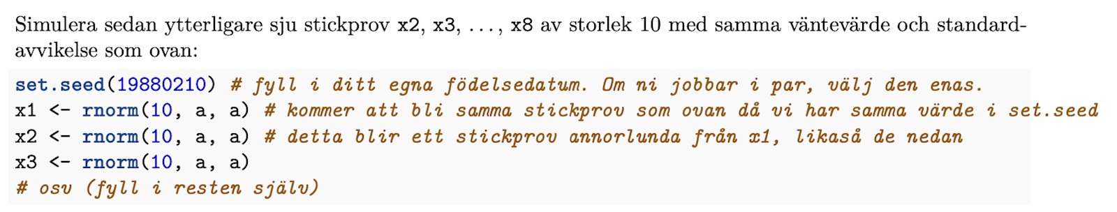 Jag har en uppgift i Statistisk analys. I uppgiften ska jag simulera 8 stickprov av storlek 10.