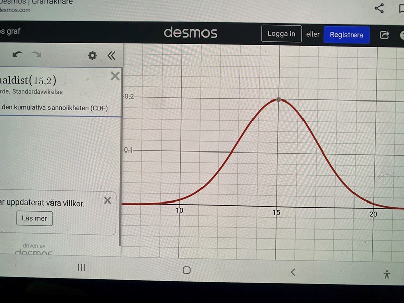 Hur kan en normalfördelnings kurva de ut såhär om standardavvikelsen är 2 timmar och medelvärdet 15? Medelvärdet förstår jag men inte standardavvikelsen? Borde det inte stå 25 där det nu står 20?