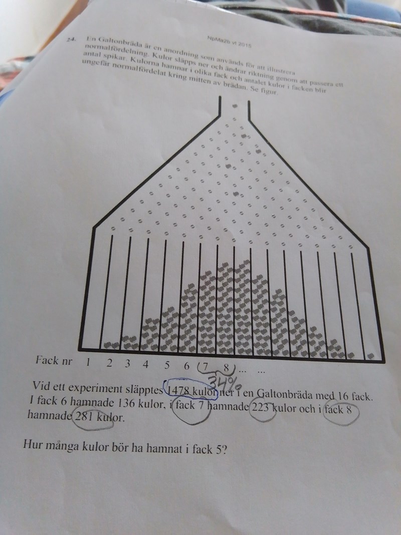 Vill någon vara vänlig och hjälpa mig med den här uppgiften? Antal kulor i Fack 7 och 8 är ungefär 34% (1 sd). Men hur ska jag kunna ta reda på antalet kulor i fack 5, mha antalet kulor i fack 6? Jag har grubblat på det här problemet i flera timmar!!!