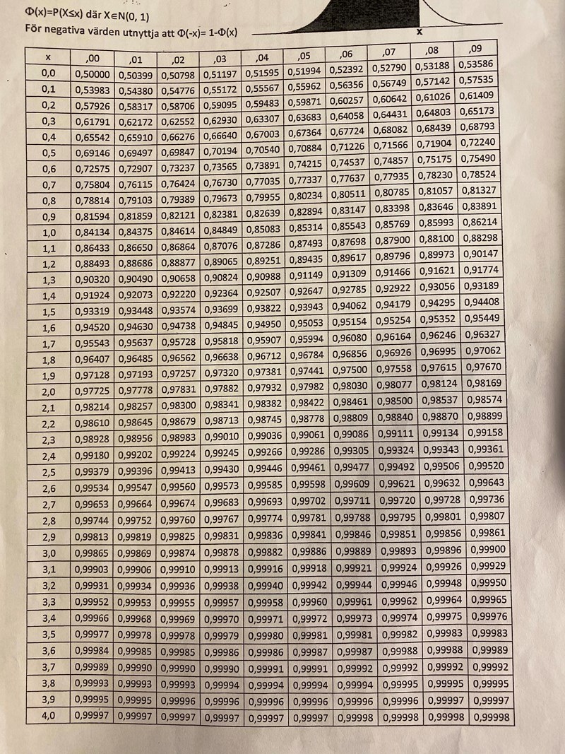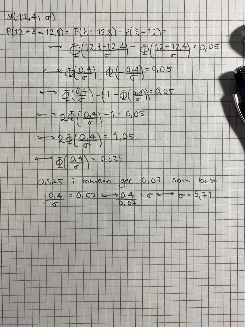 "I en svarv bearbetas metallcylindrar så att de får en viss diameter som antas N(12,4; σ)-fördelad. Vilket värde får σ högst ha för att i det långa loppet 5% av cylindrarna ska få en diameter utanför intervallet [12,0; 12,8]?"