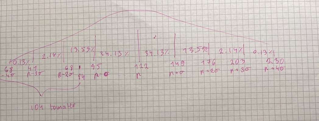 Jag har problem med denna uppgiften… Jag har ingen aning om hur man räknar när någonting ligger mellan de exakta gränserna på procenten som ligger där man adderar och subtraherar med standardavvikelsen.