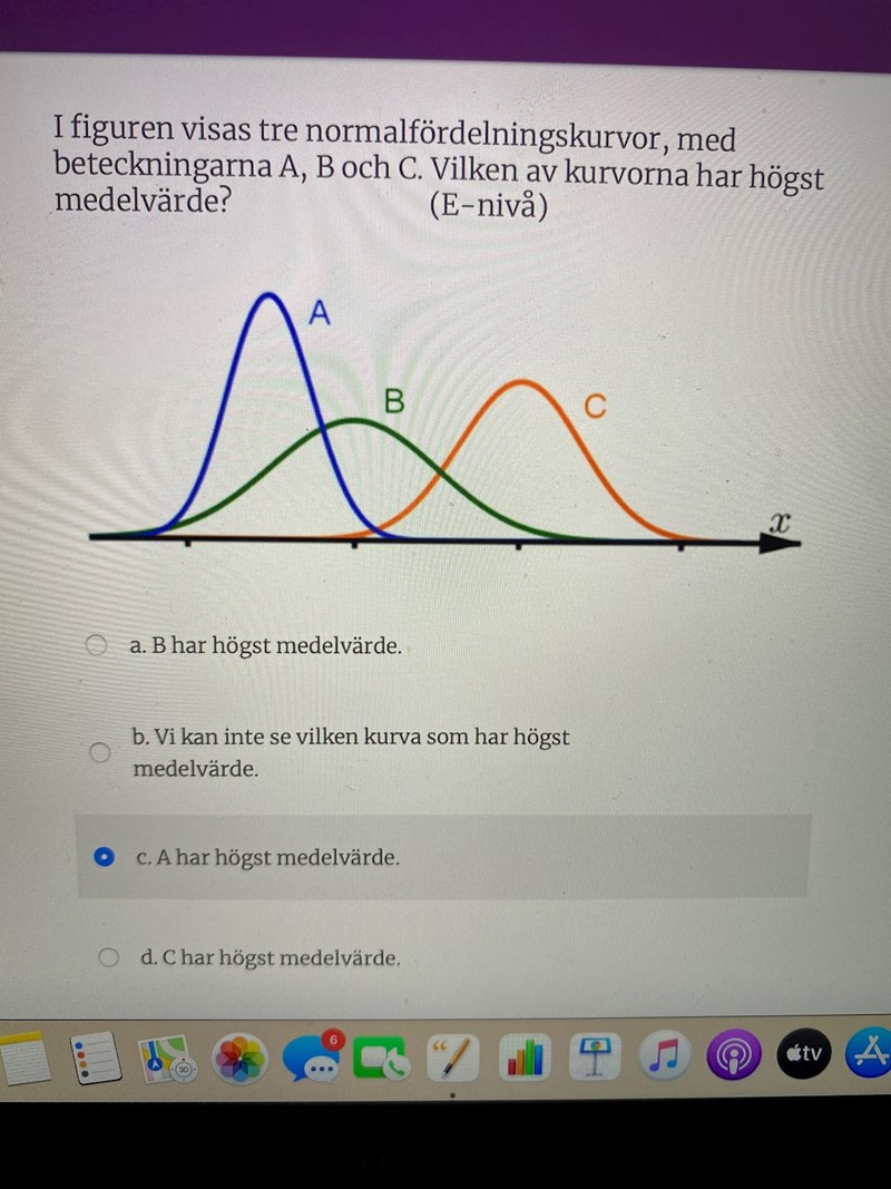 Hej, hittar ej i boken om normalfördelningskurvor som ser ut såhär. Jag tror att A har högst medelvärde men tänker jag rätt?