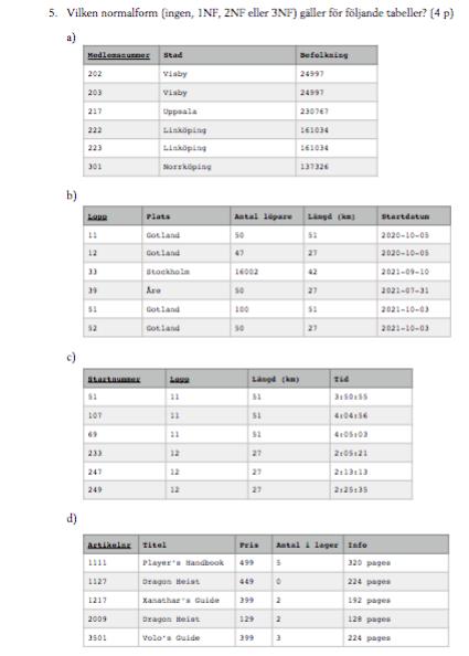 a) För att tabellen skall uppfylla kraven för andra normalformen måste den vara i första normalformen. Det skall inte finnas fullständiga beroenden mellan attribut och primärnyckeln. Vi ser att i fråga a, så är attributen befolkning beroende av stad. Därför uppfyller den kravet för 2NF.