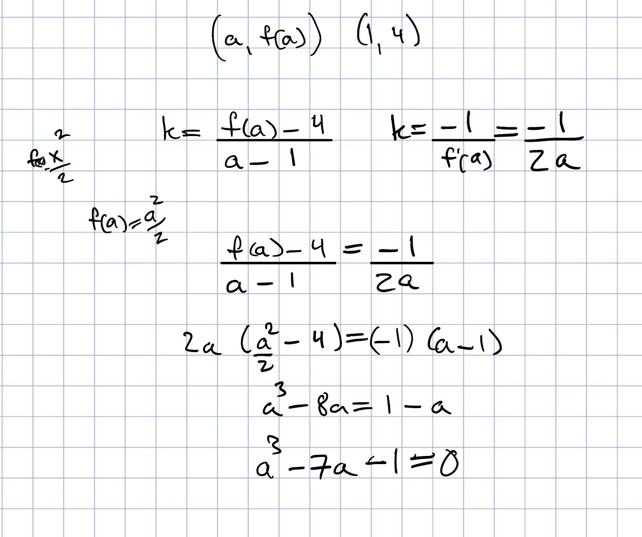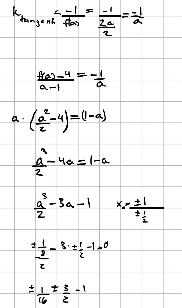 Jag tänker mig att att jag har en punkt (1,4) och en punkt (a,f(a)) sätter ett uttryck för k lutningen mellan punkten. Och samma lutning som blir -1/f'(a)= -1/2a.