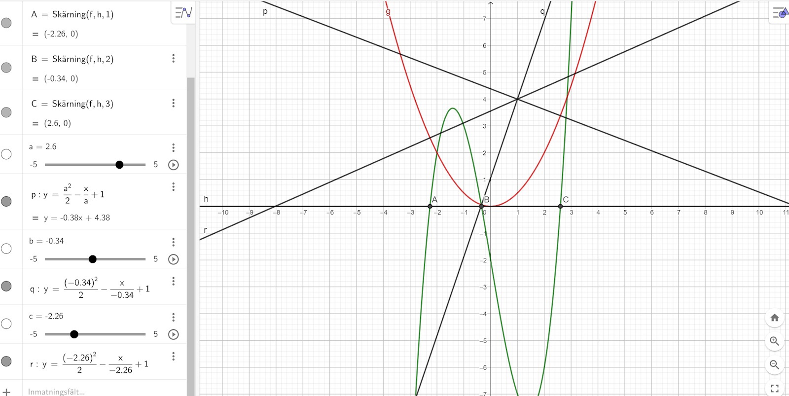 På bilden syns det att lösningarna till tredjegradspolynomet blev: -2.26; -0.34; 2.6