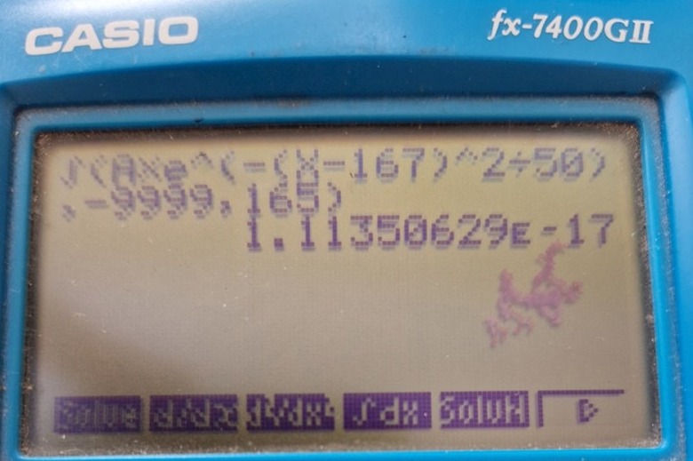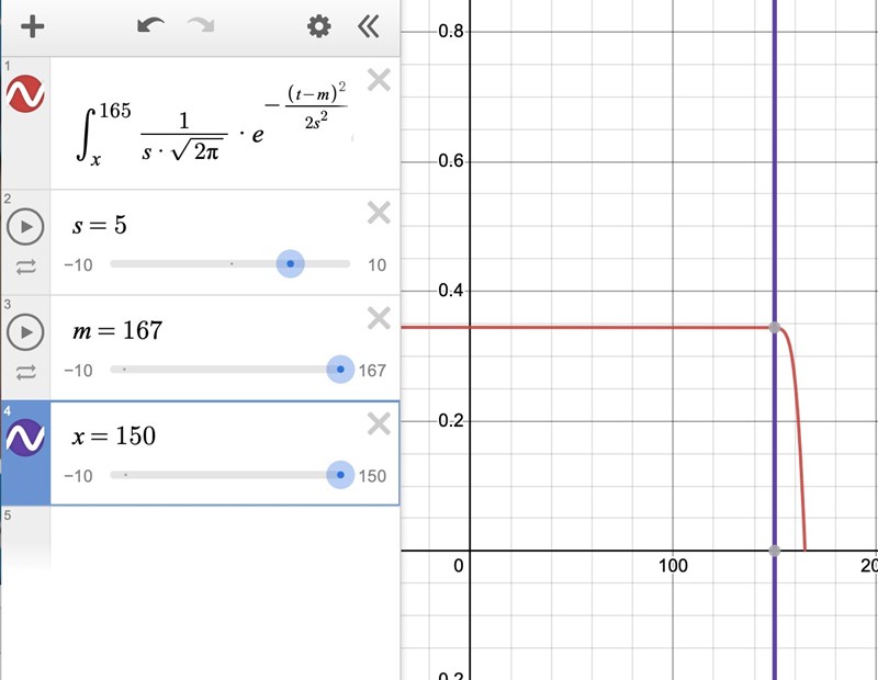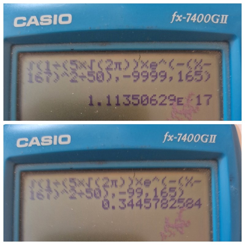 Vad märkligt! Det verkar som att din räknare gör något knasigt, för det svaret stämmer inte. Men i princip spelar det ingen roll – du kan använda -100 istället för negativ oändlighet om medelvärde och standardavvikelse medför att normalkurvan hamnar långt bort ifrån . I denna uppgift är -100 cirka 53 standardavvikelser från medelvärdet. 3 standardavvikelser nedanför medel utgör cirka 0,3% av värdena, så vid 53 standardavvikelser bort finns det ingen chans att det kommer att påverka värdet.