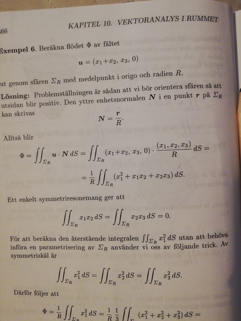 där den sista likheten kommer av att ekvationen för en sfär med centrum i origo och radie R är