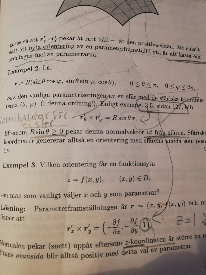 HEJ, igen så när vi ska beräkna flödesintegral bli normalen normerat, men när vi beräknar ytintegral behöver vi inte normera normalen.