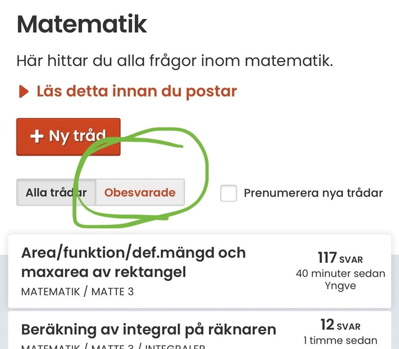 Notera också att det finns ett reglage där du kan välja att visa alla eller enbart obesvarade trådar. Just nu är det sommarlov, så det kommer inte så många nya trådar. Det lär bli mer aktivitet framåt september 🙂