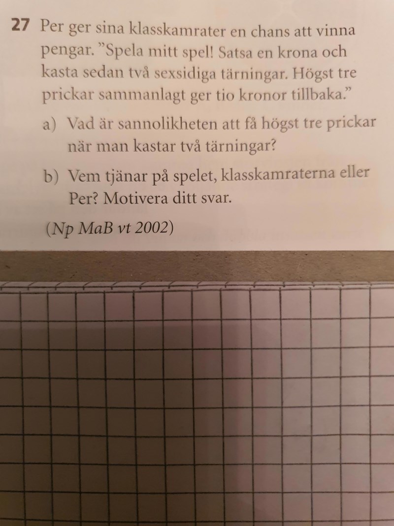 Det är som vi ser definitivt större chans att (33/36) att han vinner går plus en krona än att han förlorar och går minus med 9 kronor(3/36). Det gör ju att det ser ut som ett bra spel för Per. Däremot måste man tänka på att klasskamraterna kan spela många gånger.