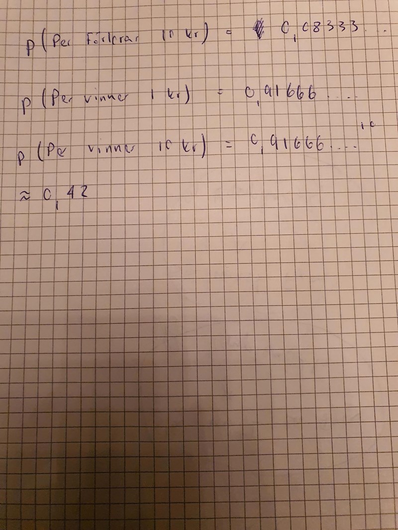 Således så kommer klasskamraterna i 8,33.. % av fallen att vinna 10 kronor. Då kommer Per gå minus 9 kronor(eftersom de gav en krona som insats)