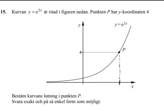 Om du vill hitta x-värdet för P, behöver du sätta in y-värdet 4 i kurvans funktion, inte derivatans. Om du sätter in värdet 4 i derivatans funktion, hittar du den/de x-värden där lutningen är fyra, inte där funktionsvärdet är fyra. :)