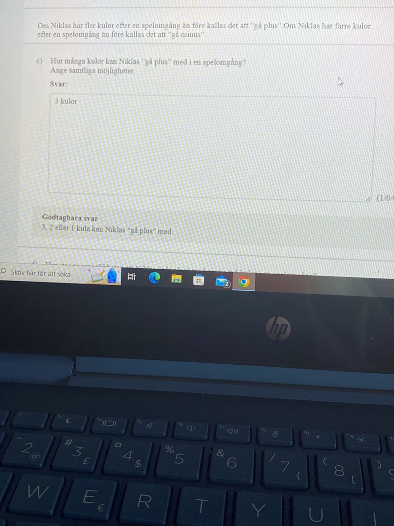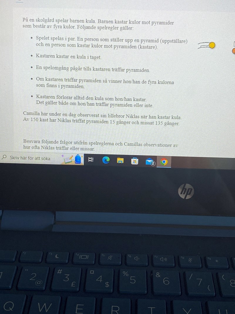 Jag förstår inte, hur kan Nicklas gå plus med 2 och 1 kula? Om Niklas kastar 1 kula och träffar förlorar han 1 och får 4, han går plus 3. Om Niklas kastar 2 kulor och prickar på det andra kastet har han gått plus minus 2 kulor. Och om han kastar 3 kulor och prickar på det tredje har han ju gått minus 2 kulor, inte plus. Han kastar 3 och får 4, vilket blir minus 2 kulor