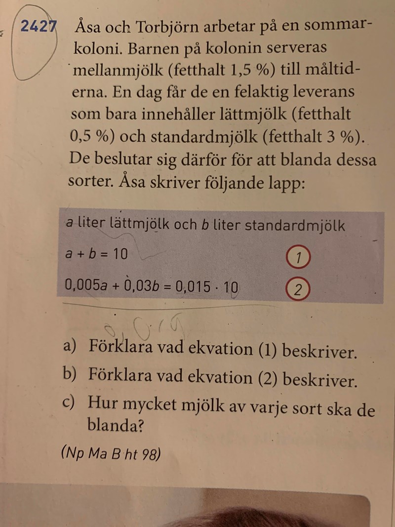 Börja med att visa vad du fått fram för svar på a) och b), det är viktigt för att förstå fråga c).