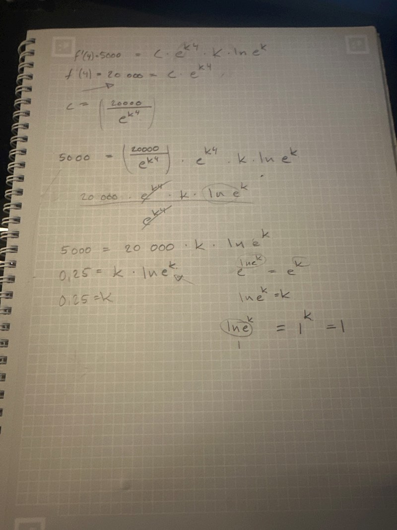 Om f(t) = C•ekt så är f'(t) = C•ekt•ln(ek) = C•ekt•k, inte C•ekt•k•ln(ek) som du skrev
