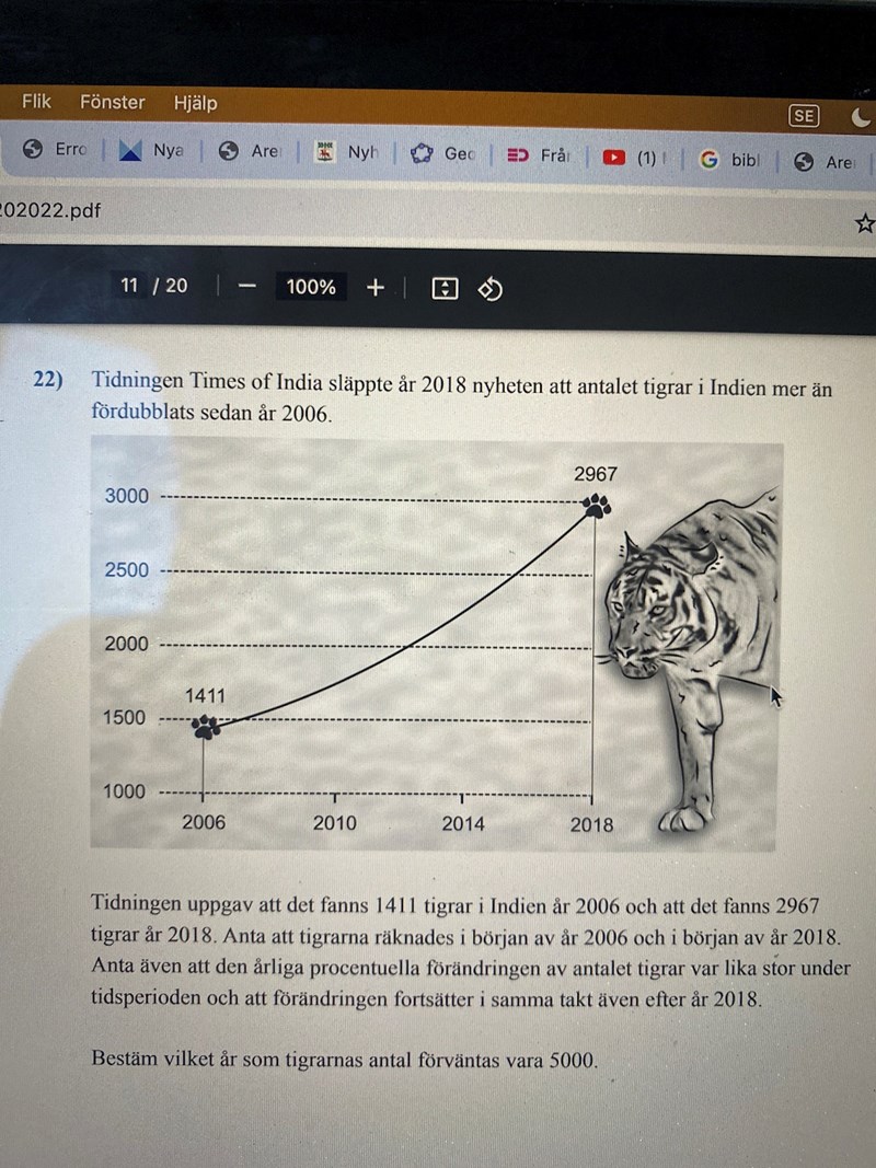 För att ta reda på hur många år det tar för antalet tigrar att öka från 1411 till 5000 ska du sedan lösa ekvationen