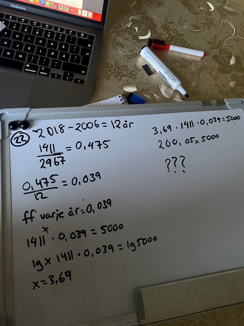 Inga problem. Mycket bra att du försökte själv och väldigt tydligt visade dina uträkningar! :)